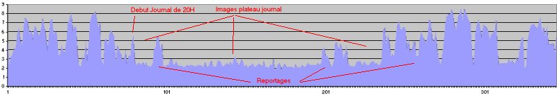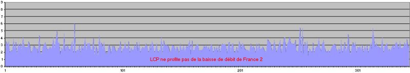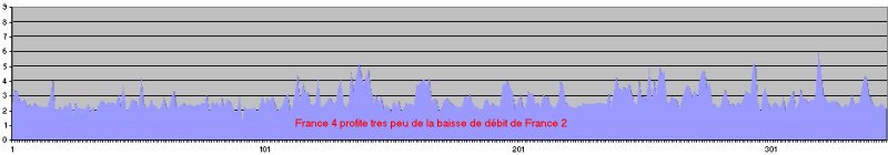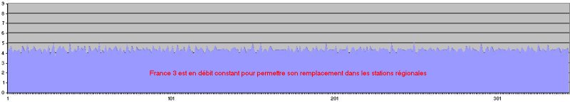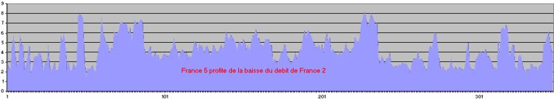 On voit que la somme des débits des chaînes reste autour de la valeur max de 22Mb/s. France2 qui pendant les images de plateau du journal a son débit qui baisse , permet à France 5 et Arte d'en profiter. France3 reste en débit constant, pour permettre le remplacement au même débit des France3 régionaux dans le multiplex.